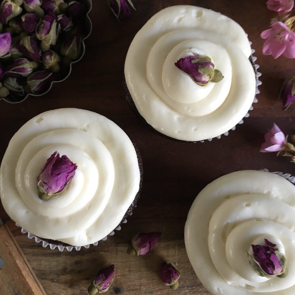 Light and fluffy and intensely chocolate cupcakes topped with luscious white chocolate cream cheese frosting.