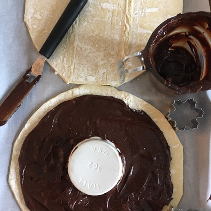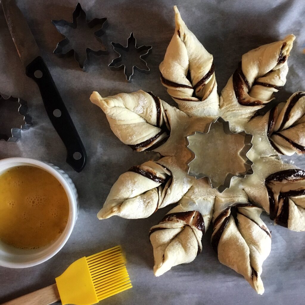 1. Use the extra chocolate mixture and any remaining orange zest to fill your extra pieces of dough (I fill the center of my snowflake cutout…I also twist the other edge pieces together to make shapes and fill those too! – I mean, why waste good chocolate and pastry dough?!).